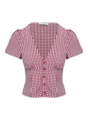 The CherryGrove™ Isolda Top is your perfect mix of vintage charm and contemporary style. Featuring a timeless red-and-white gingham print, delicate cap sleeves, and a deep V-neckline, this blouse is designed to flatter and turn heads.